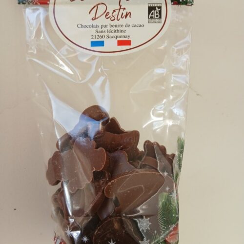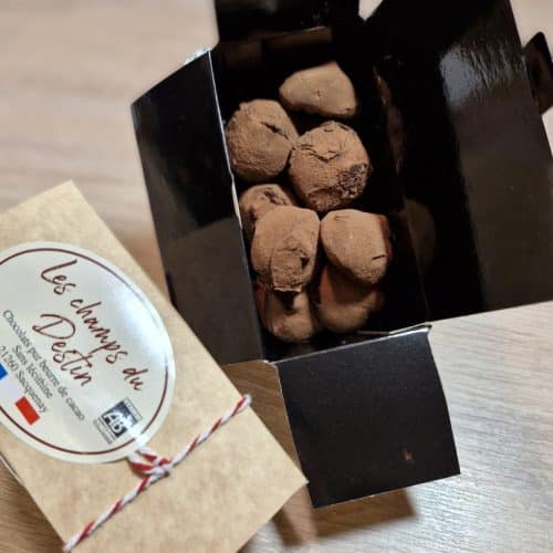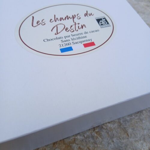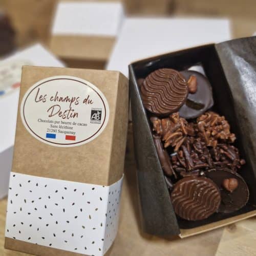 Assortiments de 90 bonbons noirs et lait de chocolats biologiques, pur beurre de cacao, sans lécithine. Tous nos chocolats sont fait maison dans notre petite chocolaterie située à Sacquenay. Gamme composée de ganaches aux fruits, de pralinés de différentes graines et fruits secs et d'autres bonbons. La sélection des matières premières est une priorité pour l'élaboration de cette nouvelle gamme.