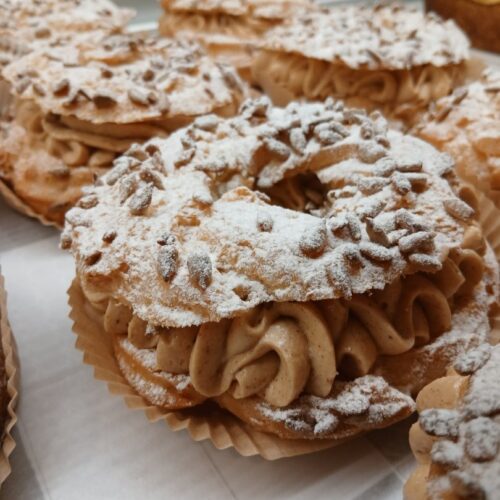 Sur une base de pâte à choux et une crème pralinée, vous trouverez sur son dessus des graines de tournesol.