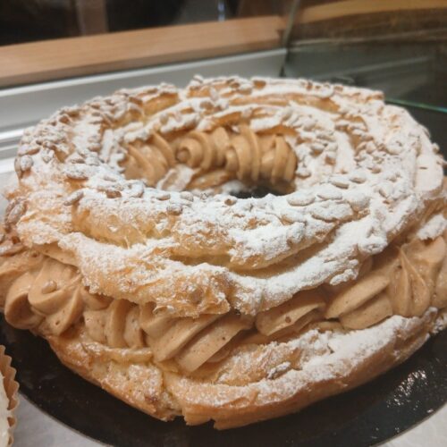 Paris-brest pour 6 personnes, base de pâte à choux avec une crème pâtissière pralinée et des graines de tournesol sur son dessus.