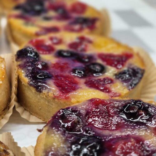 Ingrédients : Fruits rouges*, crème fraîche*, farine de grand épeautre*, sucre de canne*, lait entier*, beurre*, oeufs*, sucre glace*, Miel*, poudre d'amandes*, farine de blé T65*, sel de Noirmoutier