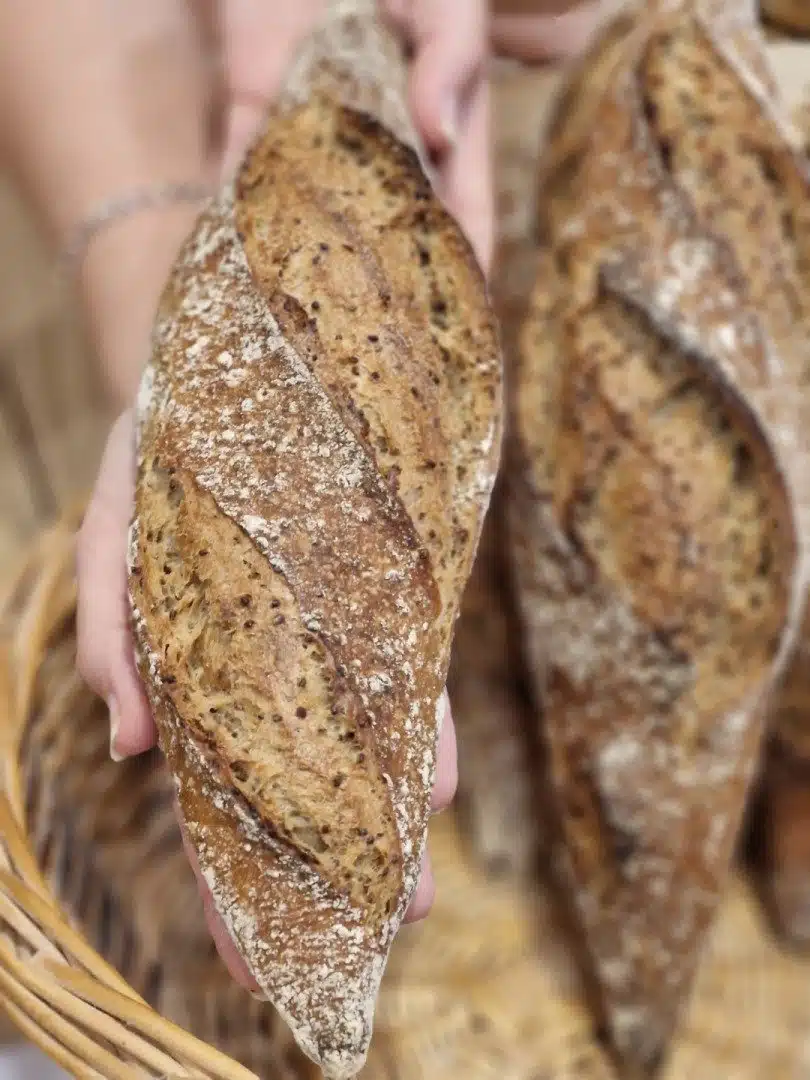 Pain de 200g à partir de farine de gaudes et graine de caméline. Graine douce et croquante qui donne un goût herbacé au pain
