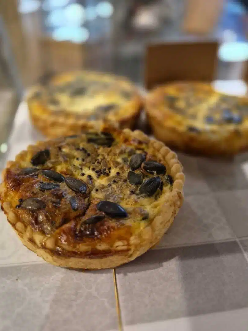 Tarte salée individuelle aux graines (tournesol, colza et courge) sur une base de pâte à quiche à base de farine semi complète.