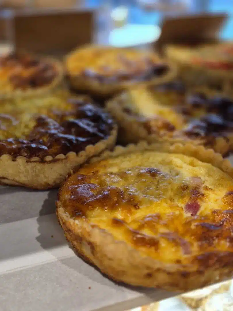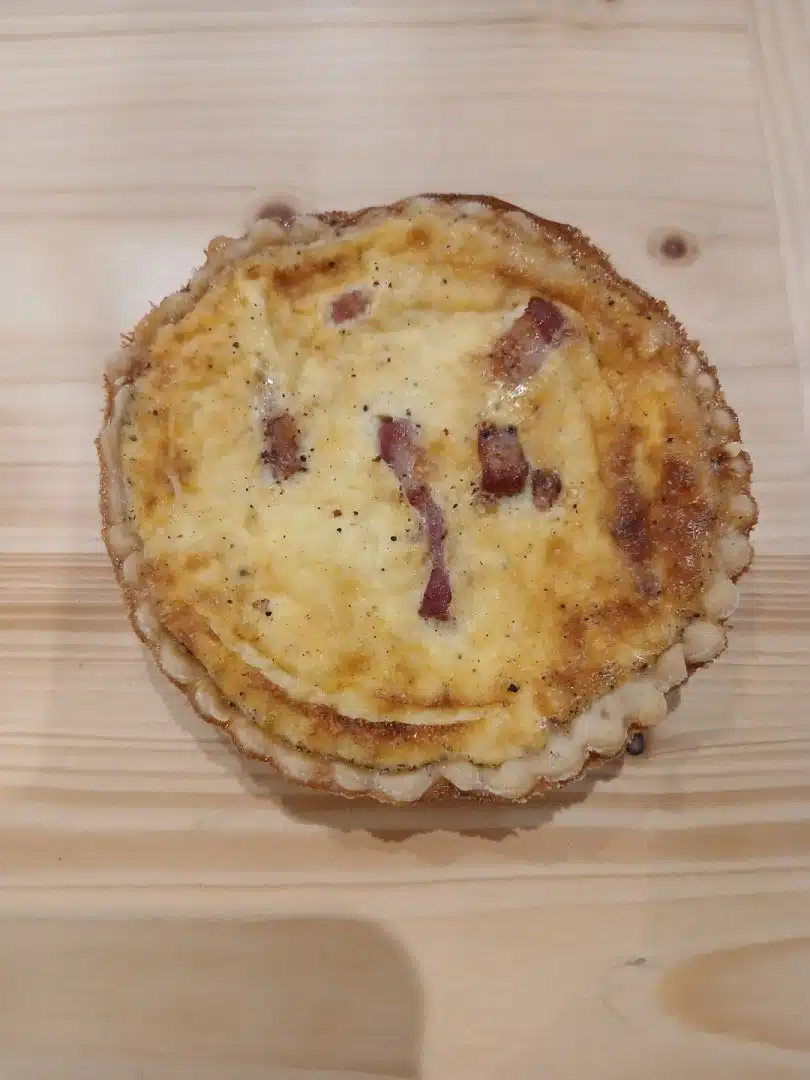 Tarte salée individuelle aux lardons sur une base de pâte à quiche à base de farine de blé semi complète.